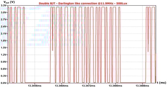 Next, the data transmission frequency efficiency of each topology is considered. For this purpose, the light intensity (and consequently the corresponding photocurrent) was kept constant at the value of 500 Lux.
