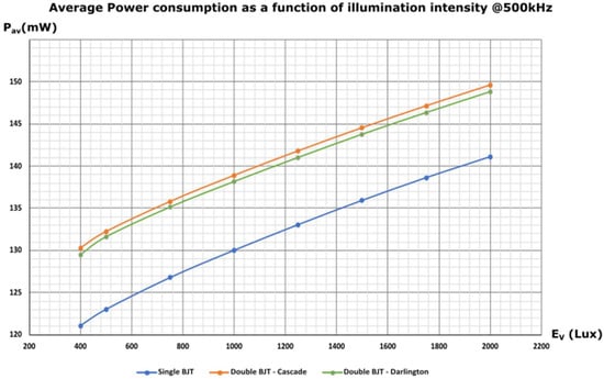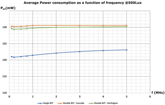 Moreover, the average power consumption of the receiver AFE as a function of illumination intensity for the three topologies (at a constant frequency of 500 kHz) is presented in Figure 17. The 500 kHz frequency was chosen aiming to reduce the simulation time, given that the frequency does not influence the power consumption, as discussed above.