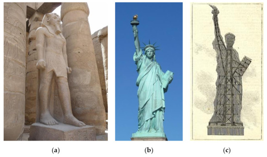 Many technological innovations have been made for the creation of big statues, as monumental statues in public space are unique, and each construction demands a different engineering approach. One admirable creation in antiquity, between other colossal statues, is the statue of Ramses II in the first peristyle court at Luxor (1400 BC) (Figure 1a), and in modern times, the Statue of Liberty, designed by French sculptor Frédéric Auguste Bartholdi (Figure 1b). The metal framework of the Statue of Liberty was designed by Gustave Eiffel (Figure 1c). Other impressive huge statues are Six Grandfathers (Mount Rushmore) [16], The Motherland Calls (Mamayev Kurgan in Volgograd, Russia) [17], the Statue of Unity (Narmada District, Gujarat, India) [18] and many more. These paradigms are remarkable and unique technological achievements.