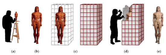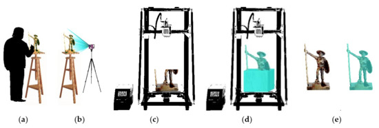 With this process, the artist can create the model digitally or naturally. Digital models are sent directly to the 3D printer. Natural models are scanned (Figure 10a,b). The scanning can be performed with a laser scanner or using the principles of photogrammetry. These methods export 3D digital model files, which are compatible with a 3D printer. There are two main methods of 3D printing: adding the material in layers (Figure 10c) or removing the material from a mass (Figure 10d). The artifact can be created with synthetic materials, metals or even marble stones (Figure 10e).