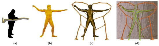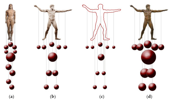 Analysis of forms and forces in Ancient Greek sculpture: (a) massive marble, carving method: Kouros c. 530 BC; (b) massive marble, simulation of Poseidon of Artemision c. 460 BC; (c) lost-wax casting (as created) of Poseidon of Artemision c. 460 BC (section of the statue represents lost-wax casting method); (d) massive bronze, Poseidon of Artemision c. 460 BC (statue figures adapted from [27,28]).