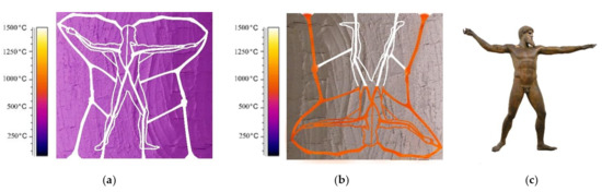 Figure 3, Figure 4 and Figure 5 show the lost-wax casting method. The artist makes the model from clay or wax, and after his study, he creates it to the preferred scale (Figure 3a,b). For the next step in this process, a craftsman creates the mold of the sculpture (Figure 3c,d). Subsequently, the craftsman presses wax (7–10 mm) into the mold to make a shell of the same statue in wax (Figure 4a,b). Then, the craftsman installs a network of wax tubes (Figure 4c) that will be the pathways of the outgoing melted wax and metal to fill the empty space without trapping air inside it. In this example, the wax tubes are placed inside the body to lead the wax out, and wax tubes outside the body to lead the metal in (Figure 4c). Normally, both networks are inside the body for a life-size statue.