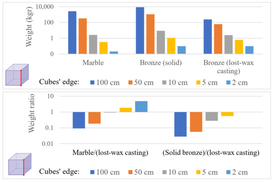 Although every statue is different, the distribution of volumes is stochastic, and the width of the bronze shell in the lost-wax casting process is dependent on the craftsmen who made it; Figure 6 shows the weight of cubes with different edges if they were made using marble, solid bronze or bronze with the lost-wax casting process and the weight ratio between different techniques (4 cube faces).