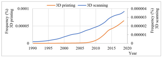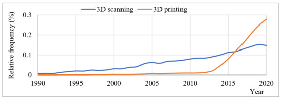 The next step in 3D scanning was the integration of digital technology, which began during the 1960s [42], but an increasing trend of “3D scanning” can be found in papers and articles after the 1990s when computers started to become much more powerful (Figure 8 and Figure 9). The first 3D scanning of large statues can be found in the report of “The Digital Michelangelo Project: 3D Scanning of Large Statues” by the University of Stanford, in 2000 [43]. Digital 3D printing started in 1984 [44,45], but the systematic research is more recent and began around 2010 (Figure 8 and Figure 9).