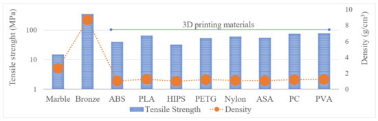 In order to evaluate the effectiveness of 3D printing in traditional materials, we compare the materials used in 3D printing against marble and bronze [126,127,128]. The loads in a statue are defined only by its own weight; this means that density is critical. In addition, we have to consider that the goal in sculpture is the freedom of the forms; therefore, critical loads of the structure are mostly tensile loads. Figure 11 shows that 3D printing materials are significantly lighter and stronger than marble. Considering metal 3D printing [129], we note that 3D printing adopts the strength of bronze and other more durable metals, such as titanium [52,130,131].