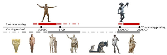 Sculpture techniques began with the carving method in prehistory until the era of Classical Greece, where it changed to the lost-wax casting method, which helped the expression of artists and mainly liberated the depiction of statue movement. During the Dark Ages, the lost-wax casting method was forgotten, and medieval statues were created using the carving method. In Renaissance, Da Vinci and Cellini recovered the lost-wax casting method, which used the same principles until now. Three-dimensional printing is the only new technique for making sculptures since Classical Greece and is a very important innovation of our days (Figure 12).