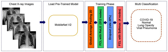 In recent years, artificial intelligence (AI) has been established as a powerful tool in the field of medical services for classification, prediction, diagnosis, detection and segmentation [13,14,15,16,17,18]. In medical imaging, DL in chest X-rays has been shown to play an essential role in the detection of viral pneumonia, bacterial pneumonia and other chest diseases [19,20]. With the rapid spread of the virus and the fight against pandemics, researchers are using state-of-the-art DL techniques to classify COVID-19 X-rays [21,22,23,24]. Therefore, the design and development of DL models for the classification of COVID-19 infected radiographs is an urgent need to address the pandemic to make appropriate clinical decisions and significantly reduce workload [25].