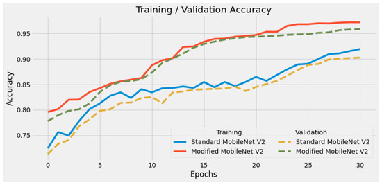 Comparison of training accuracy of standard MobileNetV2 and modified MobileNetV2. Our modified DL model presents a stable high accuracy due to its minimum loss per epoch.