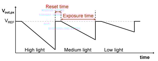 A schematic representation of the voltage output for a 3T–APS pixel is presented in Figure 2, showing how the operation sequence consists of three stages: