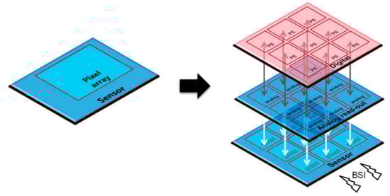 In the case of Front-Side Illumination, the optical path includes the total Back End Of Line (BEOL) thickness, inducing losses and crosstalk between pixels, because of the reflection on the metal lines. By flipping the sensor so that light drops directly on the photodiode without passing through the pixel’s BEOL, the BSI integration scheme can be achieved. This is illustrated schematically in Figure 3, along with the example of stacked tiers of a 3D integration. The BSI scheme has become the preference for high-end consumer applications, dictated by the mobile phone market which requires continuously higher resolution for the same sensor size [3,4]. Currently, more than half of the mobile phone market utilize BSI integration [15]. Since 2010, the industrial trend is to combine BSI and 3D stacking/integration to reach ultimate performance, while at the same time maintaining a small pixel size.