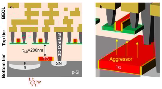 In order to extend the voltage swing of top-tier devices, analog devices with power supply of 2.5 V were considered for the top layer. In addition, the most critical condition of inter-tier coupling has been chosen by placing the TG electrode right under each one of the top layer devices, as shown in Figure 4b.
