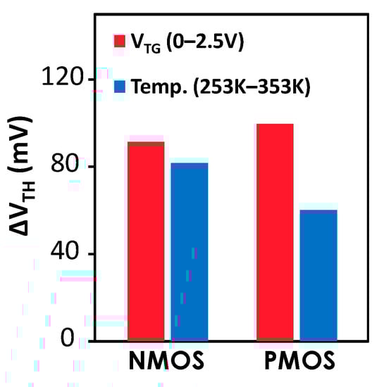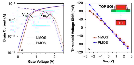 Figure 5b shows the extracted threshold voltage shift (ΔVTH) versus VTG (from −2.5 V to +2.5 V) and a nearly linear relation was obtained, which allowed the extraction of the back-bias efficiency γ for the top devices (35 mV/V for NMOS and 42 mV/V for PMOS). VTH was extracted using the constant current method [18] for each ID–VG curve.