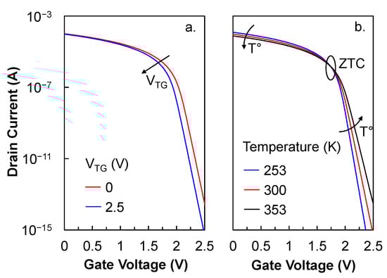 In order to evaluate the strength of TG-induced static coupling on the top device performance, we benchmarked it against a temperature variation of 100 °C, which is a typical range in consumer electronics. Contrary to capacitive coupling, the effect of temperature varies depending on the gate voltage VG. Indeed, our simulations (Figure 6) show that when proceeding from 253 K to 353 K (−20 °C to 80 °C), an increase in the leakage current and a decrease in ON current were observed, whereas at a specific gate voltage around VTH, the drain current remains unaffected by T. This effect is well known in the literature and is due to the canceling out between the rise in carrier concentration with temperature for low VG and the decrease in carrier mobility at high VG [19]. The voltage at which this happens is characterized as the Zero Temperature Coefficient (ZTC) point [20].