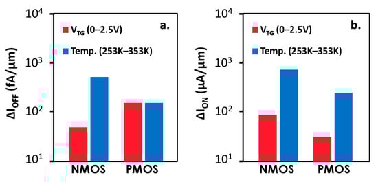 Eventually, the ID–VG shift resulting from both coupling and temperature variation can be translated in an alteration of the top device electrical parameters, namely the VTH, the leakage current (IOFF) and the saturation current (ION). The comparison of the extracted parameters for the two effects is shown in Figure 7 and Figure 8. The results show that they are approximately in the same order of magnitude while the limited ΔVTH due to the temperature variation is attributed to the ZTC point near VTH. Moreover, as observed in Figure 7, IOFF is significantly shifted with VTG, which can be detrimental for memory blocks comprising switch transistors, placed at the top-tier above TG.