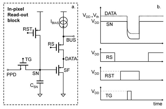 In order to carry out our analysis at the pixel level, the 4T–APS topology was selected, which consisted of an NMOS–TG and the RST, SF and RS in a PMOS circuit configuration, as illustrated in Figure 9a. As shown from the chronogram of the 4T–APS pixel readout operation presented in Figure 9b, during the readout cycle, TG was switched ON following the SN reset, allowing the diffusion of photo-generated electrons, which in turn cause a voltage drop at the input of the SF. Due to the rough unity gain of SF, the voltage drop is transferred nearly at the same level at its output.