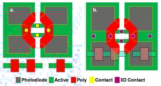 Shared pixels at photodiode layer: 2D (a) vs. 3D (b). Photodiode area (in grey) increased by 44% when the three readout transistors were placed at the top tier.