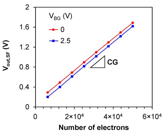 The diagram of Figure 11 shows the output voltage of SF versus the number of photogenerated electrons at SN, where it is apparent that there is a constant vertical shift of the response without significant change in its slope (CG remains the same) while varying TG bias. The former can be considered as an offset that can be easily adjusted during the readout process.