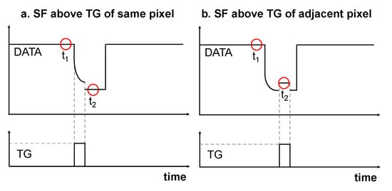 (a) For SF above a TG of the same pixel, TG switches ON during the transfer of e− from PPD to the SN. Sampling is, thus, performed at t1 and t2 without readout errors. (b) In the scenario of an SF placed above a TG of an adjacent pixel, sampling can contain erroneous value due to TG coupling.