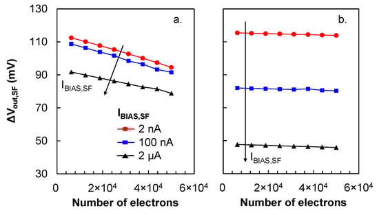 On the contrary, our second scenario considers an SF placed above the TG of an adjacent pixel (Figure 12b). In this case, TG is not synchronized with the pixel readout; hence, sampling can contain erroneous information. This sampling error ΔVout,SF has been extracted versus the number of the photogenerated electrons at the SN and for various bias currents of the SF, with the results shown in Figure 13a. In order to evaluate the strength of this error, a comparison was made with the readout error resulting in temperature variations (253 K–353 K), which is presented in Figure 13b. It is evident that the coupling-induced readout error is significant compared to the temperature-induced one, especially for low light conditions and low bias current.