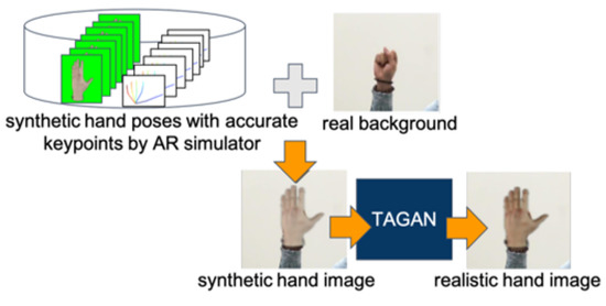 Overview of the TAGAN method for realistic hand image synthesis [33]. Synthetic pose by an AR simulator is blended with real background to yield a synthetic hand image, which is then fed to the proposed TAGAN to produce a more realistic hand image. Originally used in [33].