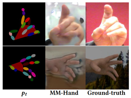 In another study by Wu et al., they proposed to directly generate realistic hand images from 3D pose and synthetic depth maps. However, unlike pose-guided person image generation, pose-guided hand generation is more challenging due to self-similarity and self-occlusion. To address these difficulties, they proposed a four-module model, MM-Hand, which contains 3D pose embedding, multi-modality encoding, progressive transfer, and image modality decoding [34]. They aimed to convert 3D hand poses to depth maps using a depth map generator. More specifically, in the 3D pose embedding module, they project the 3D hand pose onto a 2D image, given the projection matrix, which is followed by connecting the keypoints on each finger with an ellipsoid, using different colors. Then, a palm surrogate is formed through connecting a polygon from the base of each finger and wrist. Then, the depth map generator, which is a pix2pix-based model, is trained to synthesize depth maps based on any given 3D pose. Their experimental results show that the augmented hand images by their proposed approach significantly improved the 3D hand pose estimation results, even with reduced training data. The synthesized hand images using the proposed MM-Hand on the two benchmark datasets STB and RHP are shown in Figure 5.