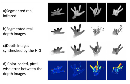 The HIG synthesizes a depth map from an infrared map. In the case of slow motion (the first and second column), the largest discrepancy is shown near the outline of the hand due to sensor noise. In the case of fast motion (the third and fourth column), the largest discrepancy is shown in blurry fingers. Originally reported in [37].