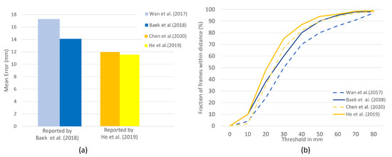 For the NYU hand dataset, we choose refs. [30,39] since the other studies with NYU do not provide the quantitative results and only compare the quality of synthesized images. In Figure 7, the results are illustrated with and without the use of synthetic images for training on the NYU dataset. As it is reported in [30], the developed method obtains 0.4 mm reduction of the average 3D joint error, compared with the current best performance by Pose-REN [41]. Moreover, the results from ref. [39] also indicate the 3.2 mm reduction in mean error due to the increase in training samples from the proposed GAN-based data augmentation model. Furthermore, the developed methods are compared by the percentage of frames at different maximum error thresholds in Figure 7b. It has shown that both studies [39] and [30] achieved higher accuracy compared to the HPE base lines, [42] and [41], respectively.