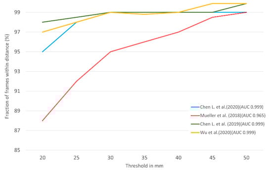 For the STB dataset, we compare DGGAN [35], GANerated [38], TAGAN [33], and MM-Hand [34] based on the reported PCK value in Figure 8. As it is mentioned, the larger the area under the curve, the higher the represented accuracy. The GANerated [38] has the lowest value of 0.965, compared to the others.
