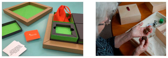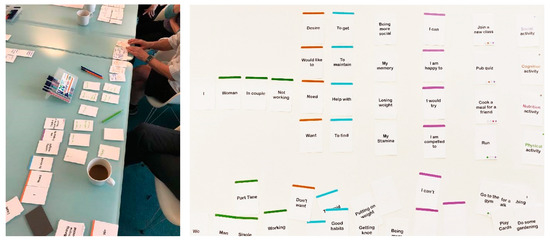 In the discover phase, a tool named Exhibition in a Box [32] (Figure 1) was used to facilitate the stage of discussion and exploration, involving 80 participants in the UK. The activity was then replicated in the other countries (Italy, Spain, The Netherlands) with smaller groups to validate the insights collected in the UK or to acknowledge cultural differences. Thanks to the Exhibition in the Box method, through a series of everyday objects, older adults started conversation about their wishes and desires for their everyday life. Relevant insights were collected regarding the different well-being domains, which were particularly useful to design the NESTORE pathways. Concerning physical activity, participants acknowledged the benefits of exercising not only in terms of physical well-being but also in terms of mental and social well-being. Indeed, physical exercise could be an opportunity to go outside, relax and stay with other people. On this aspect, users highlighted the importance of the social dimension of activities for their mental well-being. Spending time with family and friends was also driver for being motivated in doing such activities. Being able to learn something new also perceived as an important driver for motivation, but also as a possible barrier, when such expectations are disappointed. Another barrier for engaging in activities was the lack of time, especially for the “sandwich generation”, i.e., older adults having to care for both grand-children and older parents. Barriers for adopting technology were also discussed within this activity frame. The main difficulties were mainly linked to the cognitive demand required (a typical example being the difficulty to remember all the passwords).
