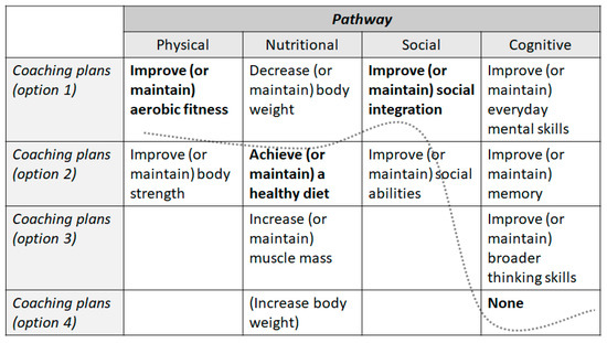 Summary of the possible pathways for a NESTORE user. In parenthesis are noted the alternatives for each coaching plan, which will be personalized according to the user needs in the specific sub-domain. For example, a user with good level of aerobic fitness and poor level of body strength will be able to choose between “Maintaining aerobic fitness” and “improving body strength”. The user is asked to choose one coaching plan in each domain, training at the same time all the dimensions of well-being. Only the cognitive domain can be skipped if there is no need for improvement. In bold, highlighted with the dashed line, a possible pathway choice.