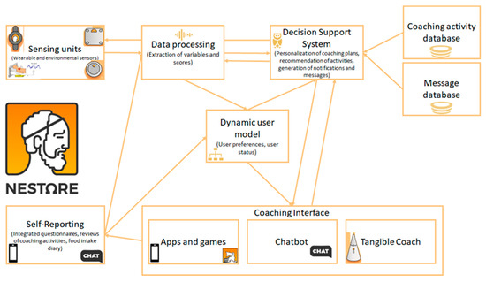 - Angelini, L.; Mugellini, E.; Khaled, O.A.; Röcke, C.; Guye, S.; Porcelli, S.; Mastropietro, A.; Rizzo, G.; Boqué, N.; del Bas, J.M. The NESTORE e-coach: Accompanying older adults through a personalized pathway to wellbeing. In Proceedings of the 12th ACM International Conference on PErvasive Technologies Related to Assistive Environments, Rhodes, Greece, 5–7 June 2019; pp. 620–628. [Google Scholar]