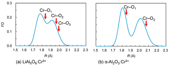 Figure 1 shows the averaged FDs of O atoms around Al in LiAl5O8:Cr3+ (a) and α-Al2O3:Cr3+ (b). Spinel-type LiAl5O8 contains tetrahedral and octahedral sites for Al3+. The crystallographic data of LiAl5O8 [20] provide 1.779 Å × 3, 1.835 Å × 1 for the A–O distances at the tetrahedral site and 1.856 Å × 2, 1.905 Å × 2, and 1.940 Å × 2 for the octahedral site. The corundum structure of α-Al2O3 consists of AlO6 octahedra forming face-sharing Al2O9 dimers (Figure S1), with Al3+ at the octahedral off-center position and the Al–O distances of 1.857 Å × 3 and 1.970 Å × 3 [21].