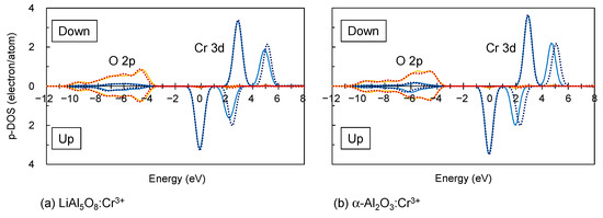 Figure 2 shows the partial density of states (p-DOSs) of Cr 3d and O 2p orbitals in LiAl5O8:Cr3+ (a) and α-Al2O3:Cr3+ (b), calculated based on the lattice relaxed by MD (solid line) and the unrelaxed lattice without MD (dotted line), where the HOMO levels are set at 0 eV. Figure 2 shows that the 3d orbitals of Cr3+ were divided into two groups, and that Cr3+ preferred the high-spin state regardless of the host material or lattice relaxation. These basic features were consistent with the considerations based on the conventional crystal field theory for Cr3+ in the octahedral symmetry.