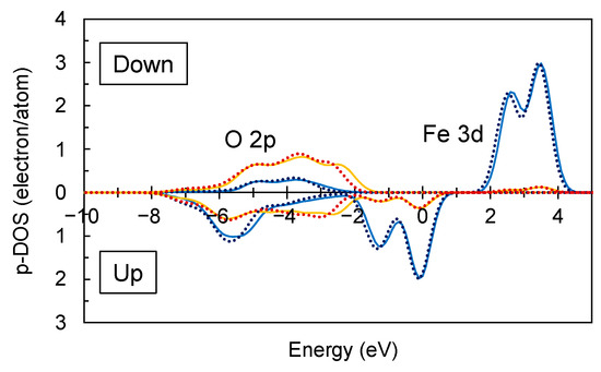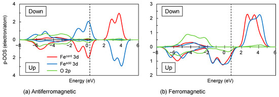 Figure 6 shows the p-DOSs of the Fe 3d and O 2p orbitals for the first-nearest Fe–Fe pair. The second- and third-nearest Fe–Fe pairs yielded the p-DOSs with substantially the same features as in Figure 6. The initial ferromagnetic and antiferromagnetic configurations converged to their respective configurations. To compare the relative stability of the systems with the different magnetic configurations, the HOMO levels of the p-DOSs were not set at 0 eV; the HOMO levels were indicated by the dashed lines. Table 3 compares the HOMO energies obtained for the different magnetic configurations. It should be noted here that the comparison should be limited to within the same calculation cluster, since the calculated energy is also influenced by the cluster type itself. Table 3 shows that the antiferromagnetic interaction was favored by 0.49 eV, 0.02 eV, and 0.05 eV for the Fe–Fe pairs at the first-, second-, and third-nearest neighboring positions, and the stabilizing effect of the antiferromagnetic interaction was particularly pronounced for the first nearest Fe–Fe pair. Such magnetic interaction was considered to be related to the well-known “superexchange interaction” often observed in compounds containing magnetically active cations [34,35,36]. Fe3+–O2−–Fe3+ in Figure S4a was about 130°, intermediate between 90° and 180°. The magnetic interaction between Fe3+ occupying tetrahedral sites have rarely been reported in the literature, whereas for Fe3+ in octahedral sites, the antiferromagnetic interaction have been reported, for example, in spinel-type ZnFe2O4 and colundum-type Fe2O3 with the Neel temperatures of ~10 K and 950 K, respectively.
