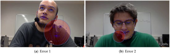 Aiming to aid the facial landmarks extractor, it is highly important to crop the input RGB image before, so as to remove the noisy background and pass only the facial image to the extractor. The above step was necessary to avoid several errors in the feature extraction process, such as the one illustrated in Figure 1a, where the noisy background of the video frame leads to wrong keypoint extraction. Such an error can be efficiently removed, by previously detecting and cropping the face of the participant before passing it to the landmark extractor. For this purpose, the well-established feature-based cascade detector [], employed in our previous work, detects and crops facial images from the captured video frames. The selection of the specific detector was based on both its simple architecture and its ability to sustain the real-time operation. The only difference between the introduced detection tool is a resize performed to each facial image after the extraction, so as to keep constant eyes distance at 55 pixels [,].