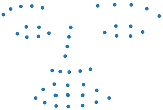 The facial images, produced from the output of the tool described in Section 2.2, were fed into a facial landmark extraction tool. Following our previous approach, the tool’s implementation was based on the dlib library, proposed by Kazemi and Sullivan []. The algorithm extracts landmarks from the mouth, nose and jaw, as well as the two eyebrows and eyes, as shown in Figure 2. The above procedure led to the extraction of 68 total facial points, each described, as usual, by its 2 spatial coordinates, x and y []. However, since the subjects had an attached microphone on the right side of their jaw, as shown in Figure 1b, the landmark detector commonly could not locate the points of the specific region. Thus, the entire facial region of the jaw was excluded from the extraction, while taking into account that the emotional state was not particularly conceived by the specific region. Consequently, the x and y values of the 49 resulting landmarks were kept in two vectors, and , forming the input at time step t to be fed into the emotion recognition tool. The difference of the current tool, compared with the extractor of our previous work, lies in the introduction of a landmarks standardization scheme. To that end, all detected features were forced to present zero mean value and standard deviation equal to 1 in both x and y dimensions. More specifically, we computed the mean and standard deviation values of each vector given a time step t. Then, the standardized values were computed, as follows: