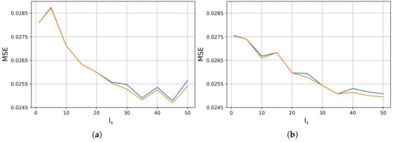 Given the superiority of RNNs in the specific application, we proceed with an experimental study that deals with the definition of an optimal value for the sequence length parameter . We searched within the range of with a step of 5. Similarly to our previous study, we kept both the best and the final MSE values of each training procedure. The obtained results are graphically illustrated in Figure 3. In the horizontal x-axis, we demonstrate the investigated values, while the vertical y-axis refers to the obtained MSEs. The blue color represents the final MSE values for each experimentation, whereas the orange represents the corresponding best ones. The above study was conducted both on and . We can observe that, for both architectures, high values of lead to better results. Yet, we have to keep in mind that the higher the , the more operating time the system requires. Hence, we search for a value that combines both low processing time and low MSEs. For better comprehension, we display the best MSE values of both architectures in Table 3. According to that, we selected , since it seemed to present close-to-optimal recognition performance in both cases, while sustaining operating time at low levels.