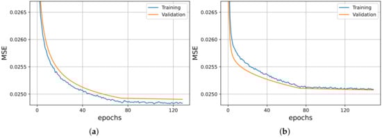 Training (blue) and validation (orange) curves of and . (a) . (b) .