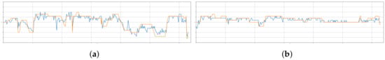 Estimated (orange) and ground truth (blue) values of valence and arousal for an indicative speaker of the testing set of RECOLA. (a) Valence. (b) Arousal.