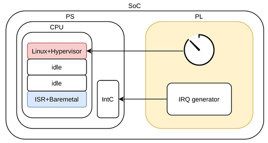 First, we investigated the impact of the hypervisor’s performance. The integration of virtualization techniques allows the coexistence of real-time and non-real-time applications running in different operating systems inside a single digital circuit. In this virtualized context, the hypervisor is responsible for monitoring and managing the independent operating systems, deciding which takes control of hardware resources in each moment. Therefore, the effectiveness of the system in the presence of interrupts or events is connected to the hypervisor behavior straightaway. We have noticed that the selected platforms for previous studies in most cases are computer ones, but they did not take advantage of reconfigurable computing solutions technologies. Besides, they do not analyze the I/O contention, such as general-purpose I/O interrupts.