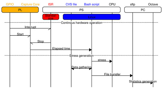 Figure 3. General flow. In the PL, the timer is started while the interrupts are generated. The ISR receives the interrupt and stops the timer. The processor also reads the timer value and generates all the files for the statistical evaluation. At the same time, the processor also stresses the memory and CPU. In an external PC, all the data are gathered and processed.