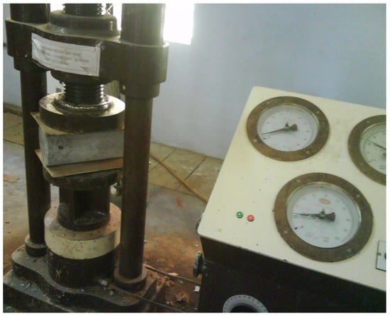 Samples were prepared for M40-grade concrete mix with sustainable water-soluble polymer (PEG-600). Compressive strength test cubes with size 150 × 150 × 150 mm3 were prepared as the samples. A compressive testing machine with a capacity of 2000 kN and with a load rate of 140 kg/cm2/min was utilized and was applied to the sample. The compressive strength experimental setup is shown in Figure 1. The load was applied gradually on the test specimen and continued until the dial gauge needle was reversed. The reversal motion of needle indicated a failed specimen. At that time, the ultimate load on the dial gauge was marked. The compressive strength was calculated as per the equation given below: