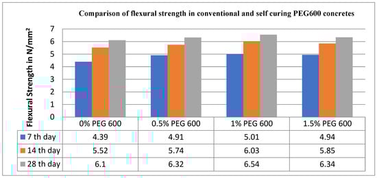 Comparison of flexural strengths of Conventional and PEG-600 concretes.