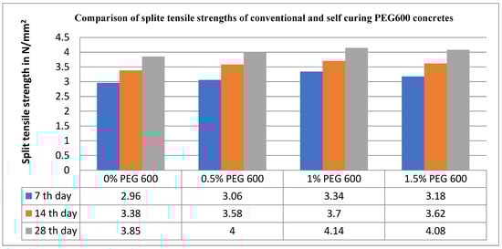 Comparison of split tensile strengths of Conventional and PEG-600 concretes.