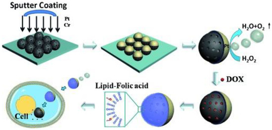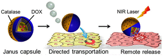 Self-propelled Layer-by-Layer (LbL) Janus capsules obtained by covering with Au and Ni layers the hemispheres of silicon dioxide particles coated with five bilayers formed by the alternate deposition of poly(4-styrenesulfonate of sodium) (PSS) and poly(allylamine hydrochloride) (PAH) have been used for drug delivery applications. For this purpose, catalase was conjugated to the Au layer for driving the catalytic breakdown of hydrogen peroxide to produce gas bubbles that can push the motor motion. The combination of this motion with the magnetic field guidance allows guiding the obtained particles to the target cells, where it is possible to release the encapsulated drugs upon Near Infrared (NIR) irradiation [36]. Figure 1 shows a sketch of the triggered transport and release of doxorubicin (DOX) using LbL Janus capsule motors.