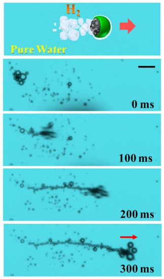 The previous example exploits the reaction of water and metals for propelling the motion of micro/nanomotors. This approach, together with photocatalytic water-splitting reactions, can be considered an excellent alternative for pushing the motion of micro/nanomotors by the generation of hydrogen or oxygen [46,47]. This results from active metals, which can react with water smoothly, e.g., magnesium and aluminum. This type of metal can generally form a passivation layer on the surface, reducing the violence of the reaction with water [48]. The seminal work on motors using water as fuel was performed by Gao et al. [49]. They fabricated a Janus microparticle composed of a hemisphere of Ti and a second one having an alloy of Al and Ga. This latter hemisphere in the presence of water reacts, producing hydrogen bubbles that can push the motion of the Janus motor with a remarkable speed of about 3 mm/s (around 150 times the particle diameter per second), exerting a force higher than 500 pN. The high speed of this type of water-driven Janus motor can be in part ascribed to the large diameter of the generated bubbles (around 10 μm) and the large size of the fabricated motor (average diameter of 20 μm), which ensure a large catalytic surface area and the formation of large bubbles. The propulsion behavior and lifetime of the motors can be tuned by changing the ionic strength or pH of the medium. On the other side, it may be expected that the control of the alloy reactivity by changing the composition or microstructure can contribute to improve the locomotion of the Janus motors. Figure 3 represents the displacement of Janus motors composed of a hemisphere of Ti and a second one of an Al-Ga alloy in water. Wu et al. [50] designed red blood cells coated on one of their sides with an Mg layer that allows an asymmetric generation of hydrogen bubbles, driving the propulsion of the motors without any external fuel and reaching an average velocity of about 172 μm/s.