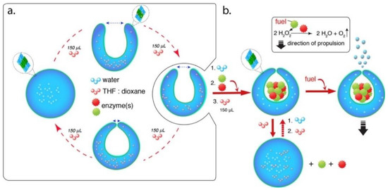 - Abdelmohsen, L.K.E.A.; Nijemeisland, M.; Pawar, G.M.; Janssen, G.-J.A.; Nolte, R.J.M.; Hest, J.C.M.v.; Wilson, D.A. Dynamic Loading and Unloading of Proteins in Polymeric Stomatocytes: Formation of an Enzyme-Loaded Supramolecular Nanomotor. ACS Nano 2016, 10, 2652–2660. [Google Scholar] [CrossRef]