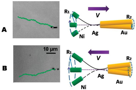 Flexible swimmers such as Au-Ag-Ni nanowires based on an undulatory locomotion mechanisms are also interesting alternatives in the fabrication of magnetically driven synthetic motors. The motion of this type of engine under the application of a rotating magnetic field occurs by the rotation of the Au and Ni segments at different amplitudes. This is possible because the torque produced by the rotation of the Ni segment as a response to the magnetic stimulus is transmitted along the Ag flexible segment to the gold head forcing its rotation. Therefore, it may be assumed that the motion of this type of swimmer is triggered by the breaking of the system symmetry. The modification of the lengths of the Au and Ni segments and the modulation of the applied magnetic field allow designing engines with forward (pushing) and backward (pulling) magnetically powered motion, and a precise switch “on/off” of the motion, respectively, providing a promising strategy for transport of biological media such as urine [67]. Figure 5 represents a comparison of the mechanism of forward and backward motion.