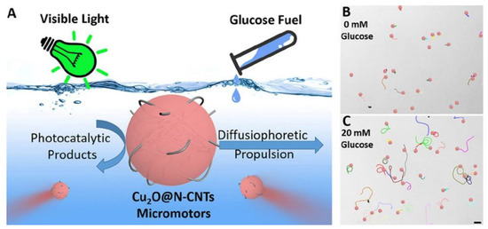 Wang et al. [85] designed micromotors based in glucose-fueled composites formed by cuprous oxide and N-doped carbon nanotubes activated under the action of environmentally friendly visible light. Thus, it is possible to move the manufactured motors with a velocity of up to 18.71 μm/s, which is similar to that obtained for Pt-based catalytic Janus micromotors fueled in H2O2 medium. Moreover, the velocity of the new type of motor can be regulated by tuning the glucose concentration or the light intensity. On the other hand, the glucose-fueled composite motors formed by cuprous oxide and N-doped carbon nanotubes can undergo a highly controllable negative phototaxis behavior. Figure 6 represents a sketch of the locomotion mechanisms of motors formed by cuprous oxide and N-doped carbon nanotubes as well as their trajectories in the absence and presence of glucose fuel.
