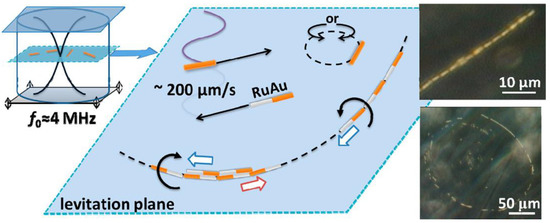 The seminal work in ultrasound-powered synthetic motors proved that the application of ultrasonic standing waves in the MHz range can drive the levitation, propulsion, rotation, and assembly in metallic microrods (2 μm long and 330 nm diameter) in aqueous medium [91]. This occurs through an acoustophoretic mechanism resulting from the microrod asymmetry, which drives its axial propulsion. The asymmetry associated with the convex and concave regions leads to an anisotropic contribution of the ultrasound pressure, which results in a pressure gradient at the microrod surface. Thus, the motors are unidirectionally propelled. On the other hand, the metallic rods can align and self-assemble to form spinning chains, which in the case of Janus microrods occurs following a head-to-tail alternating structure. Moreover, the chains can form ring or streak patterns in the levitation plane, with such patterns having a characteristic distance that is about a half of the wavelength of the ultrasonic excitation radiation. Figure 7 shows the different possible motion pathways of ultrasonic-powered Au/Ru microrods. It should be noted that the asymmetry of the microrods plays a central role in the control of their motion. For instance, the higher the asymmetry, the higher the motion speed, as was proven by Garcia-Gradilla et al. [93], who designed multifunctional rod-like nanomotors formed by three different segments (Au-Ni-Au). This type of motor can be propelled by ultrasound radiation and magnetic fields. The interaction of the latter with the Ni segments can be exploited for providing a predefined and controlled motion to the manufactured motors. Moreover, the Ni segments can be exploited for picking up and transporting magnetic materials.